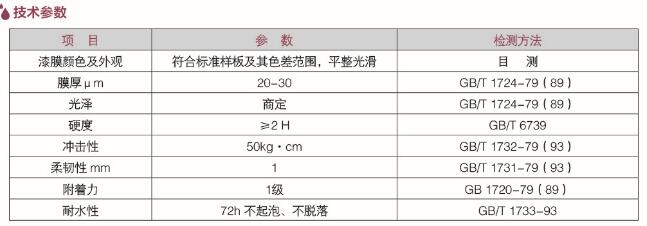 漆膜光泽高、丰满度好,同时具有极佳的硬度、柔韧性以及与基材优异的附着力,耐候性好,耐久性佳。需120℃-180℃高温烘烤。