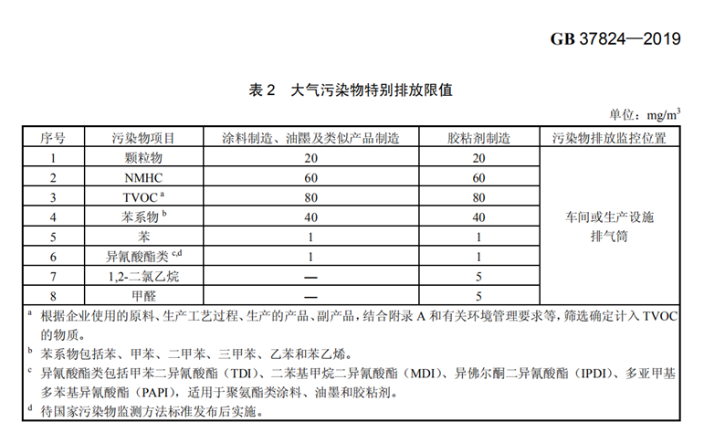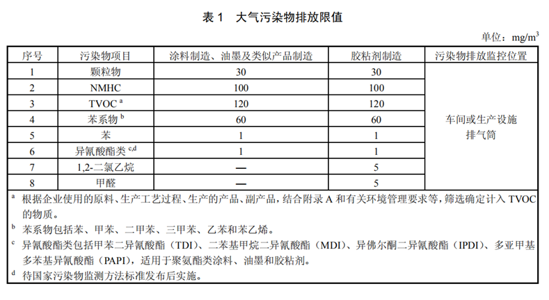 本标准规定了涂料、油墨及胶粘剂工业大气污染物排放控制要求、监测和监督管理要求。涂料、油墨及胶粘剂工业企业或生产设施排放水污染物、恶臭污染物、环境噪声适用相应的国家污染物排放标准,产生固体废物的鉴别、处理和处置适用相应的国家固体废物污染控制标准。